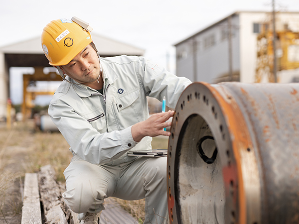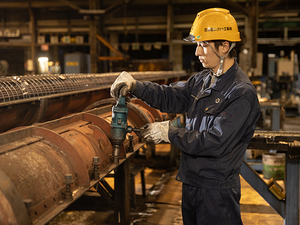 私はコンクリートポールとパイルの製造工程の中で、コンクリートを流し込む型枠の成形と、完成後、型枠をばらして製品を運ぶ、最終工程の作業を担当しています。これらの作業は、3〜4名のチーム体制で行い、クレーンで電柱を運ぶ人がいれば、他のスタッフがその次の作業にとりかかり、みんなで連動して行っています。スムーズな流れの中でも、作業の正確性は求められ、不適合品を出さないように細心の注意を払っています。また、どこかに作業に遅れが出ると応援に入り、みんなで一体となったものづくりが魅力です。